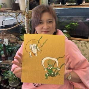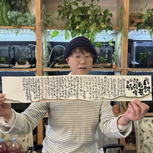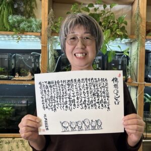 たくさんのめだかが泳ぎ、グリーンたっぷりの癒し空間での己書幸座です。