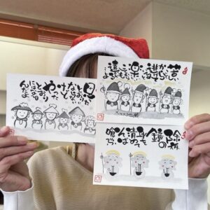 サンタ帽子被りながらも、筆を持って集中してる姿はシュールなんですよね。