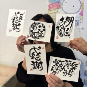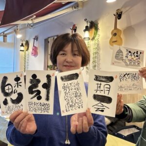 オーナーのあきさんの展示してある己書作品を見て、初めて己書を体験に来てくれた方もいました。